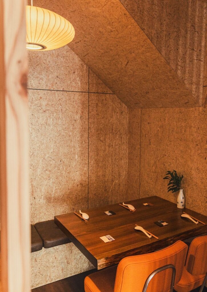 奥の半個室エリアは、OSB合板の壁と柔らかな灯りが落ち着きを演出。